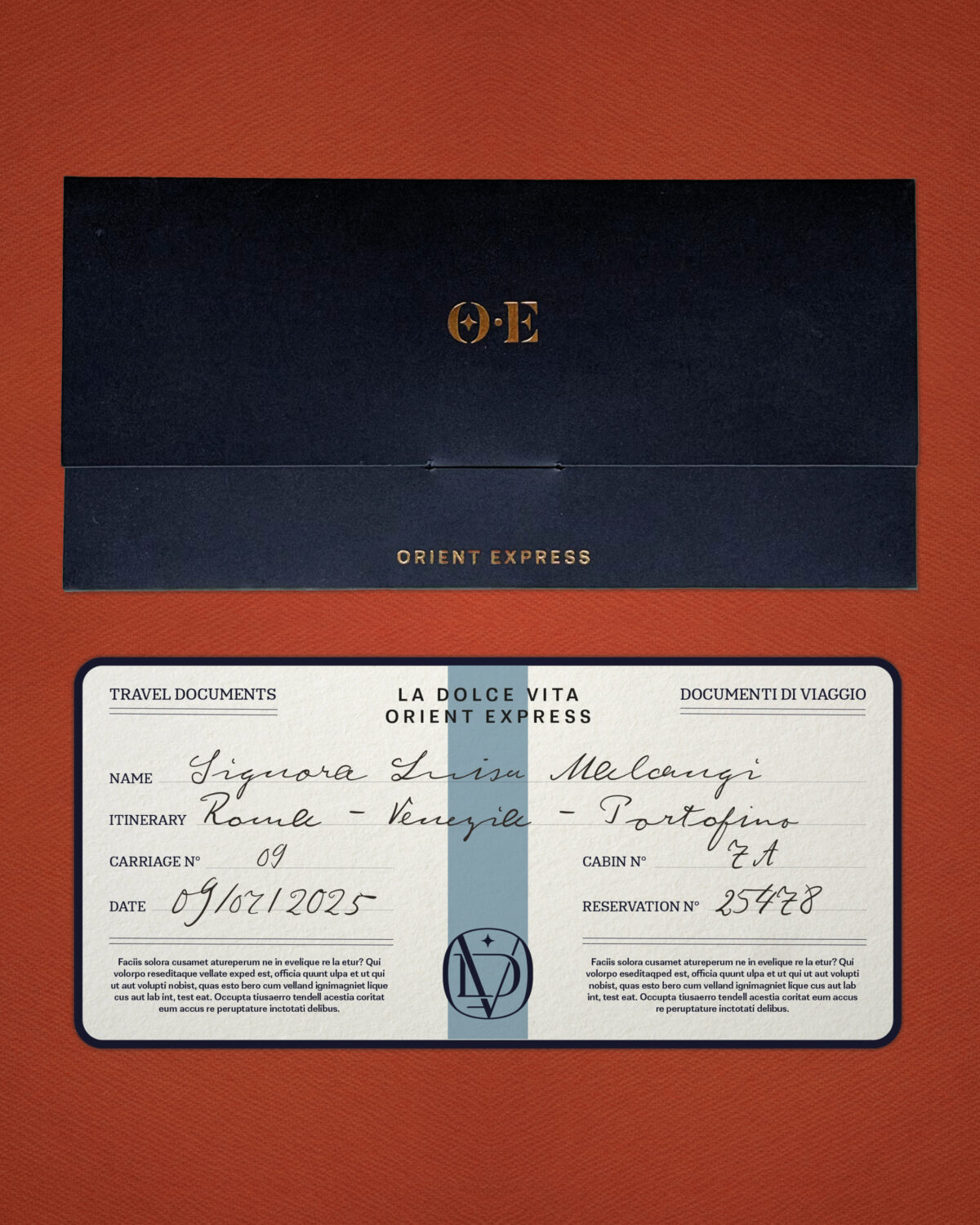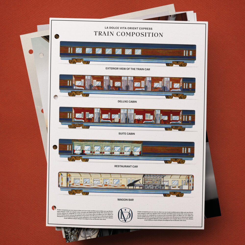 The starting point for my inspiration was the emblematic monogram of the Compagnie Internationale des Wagons Lits, a tribute to the Art Deco elements that defined the golden age of train travel. However, to add a modern touch and evoke the essence of La Dolce Vita, I incorporated design elements from the 60s and 70s, an era synonymous with bold elegance and casual sophistication. I also drew inspiration from old Italian train tickets with their distinctive blue stripe down the center to add a nostalgic dimension.
